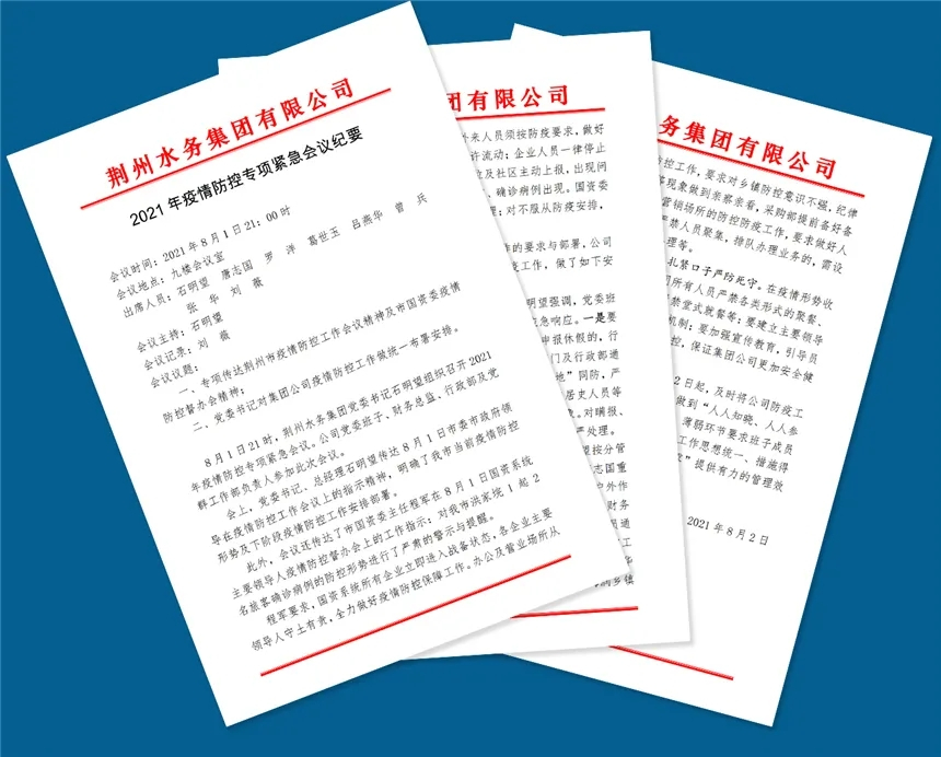 目前,荊州處于疫情防控的斗爭前沿,荊州水務(wù)集團(tuán)黨委高度重視,嚴(yán)格貫徹落實(shí)市、區(qū)疫情防控重要指示精神,嚴(yán)防疫情擴(kuò)散。8月1日21:00時(shí),公司黨委隨即召開疫情防控專項(xiàng)緊急會(huì)議,宣布公司全面進(jìn)入戰(zhàn)時(shí)狀態(tài),對(duì)集團(tuán)公司防控工作做出急緊部署。