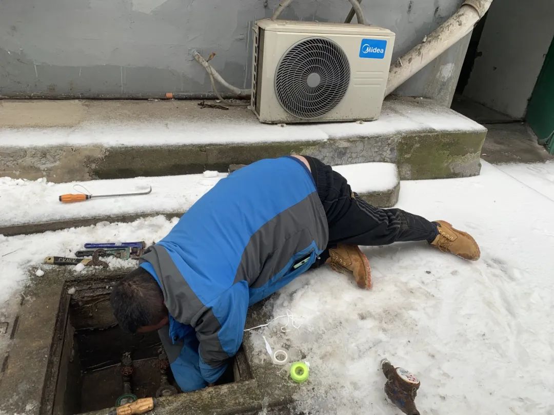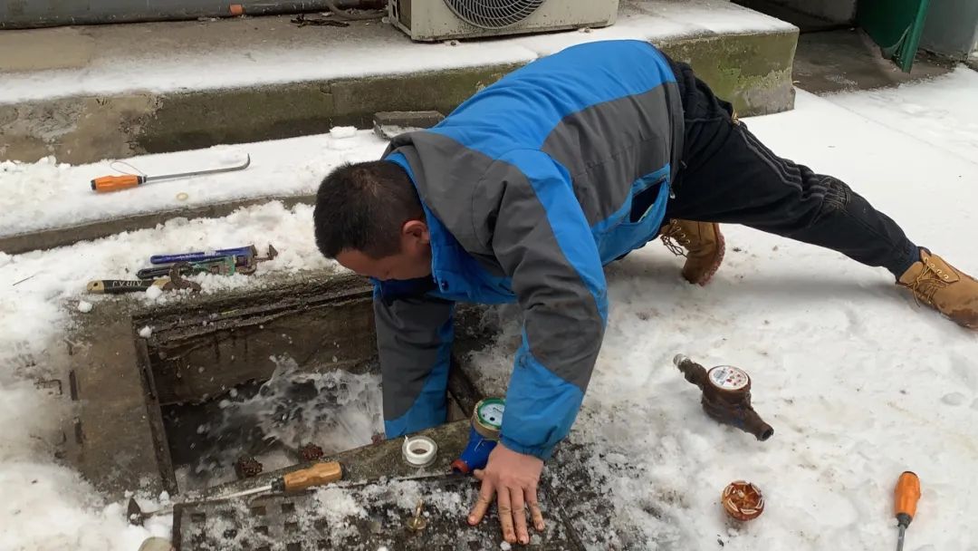 水表箱位于小區(qū)北風(fēng)口處,水表玻璃面板已經(jīng)凍破,水從破損的表面和閥門連接處噴涌出來,只見陳勁鵬師傅單膝跪地,彎腰下俯用扳手快速地扭動著水表接口,刺骨的水花四處噴射,陳師傅臉上、衣服上、袖口上濺濕的水花,在低溫的戶外瞬間結(jié)成了薄薄的一層冰花。水表拆下來后李剛師傅趕緊遞上新的水表,陳師傅快速進(jìn)行安裝,在兩位師傅默契的配合和嫻熟的操作下,水表裝上了,閥門打開了,用戶家中通水了。而師傅們的雙手因?yàn)槿探菰诒浯坦堑难┧校缫驯粌龅猛t失去知覺,跪地下俯的雙腿也已麻木難行。當(dāng)問到陳師傅冷不冷時,陳師傅感慨的說:“雖然身上冷,但心里是熱的”。