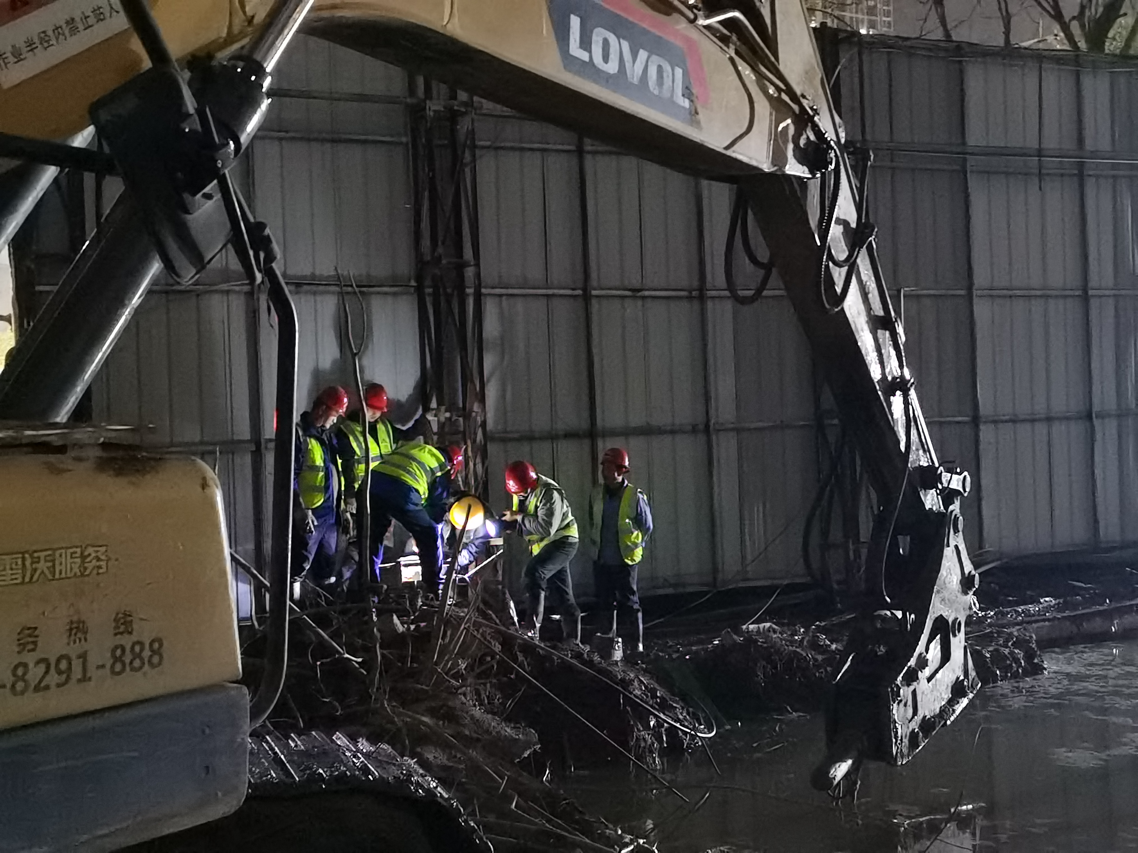 由于破損主管口徑大,道路大范圍積水導(dǎo)致排放緩慢,搶修人員調(diào)集多臺水泵同時抽排水,待晚上8時左右路面積水排盡后,漏點(diǎn)范圍也基本確定——位于江津路主干道旁金科中梁博翠小區(qū)施工現(xiàn)場圍墻處。漏點(diǎn)地處低勢且被污水淹埋、現(xiàn)場路面泥濘不堪,調(diào)配的挖掘機(jī)也早已就位,但夜色漸濃給施工作業(yè)帶來極大難度。