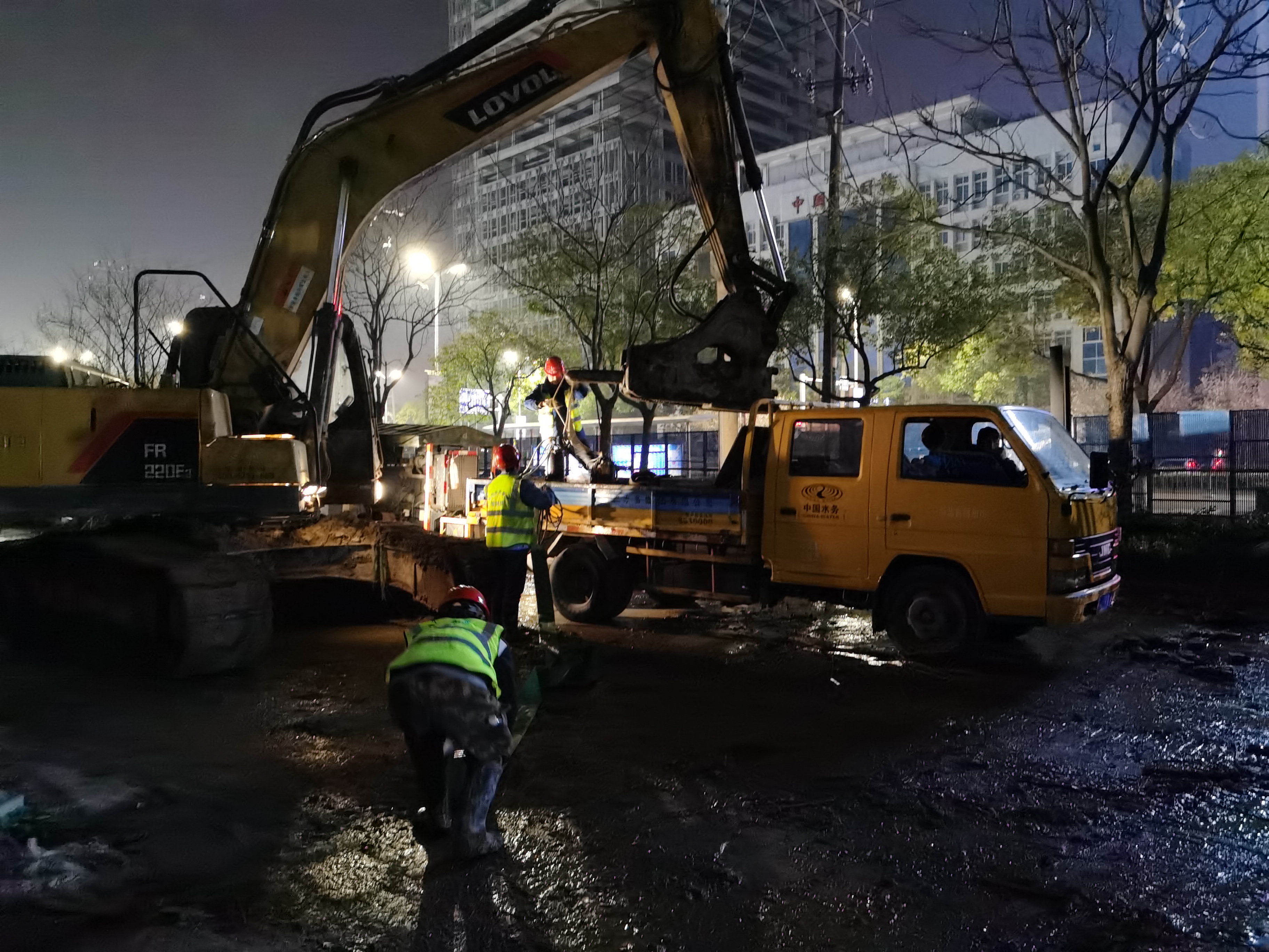經(jīng)過數(shù)小時開挖作業(yè)后,漏點(diǎn)顯現(xiàn)出來——主供水管道因破壞形成了較大裂口,此時搶修人員顧不上泥濘,分別跳入作業(yè)泥坑內(nèi),按照預(yù)定方案抓緊開始維修?,F(xiàn)場人員、機(jī)械設(shè)備密切配合,忙而不亂,經(jīng)過一整夜的緊張奮戰(zhàn),凌晨5時整個維修工作才基本完成。搶修人員對管線再次進(jìn)行了摸排檢查和排污沖洗,終于,在歷經(jīng)了12個多小時的徹夜搶修,凌晨6時武德路片區(qū)全線恢復(fù)供水,此時也正好趕上了市民用水早高峰的到來。