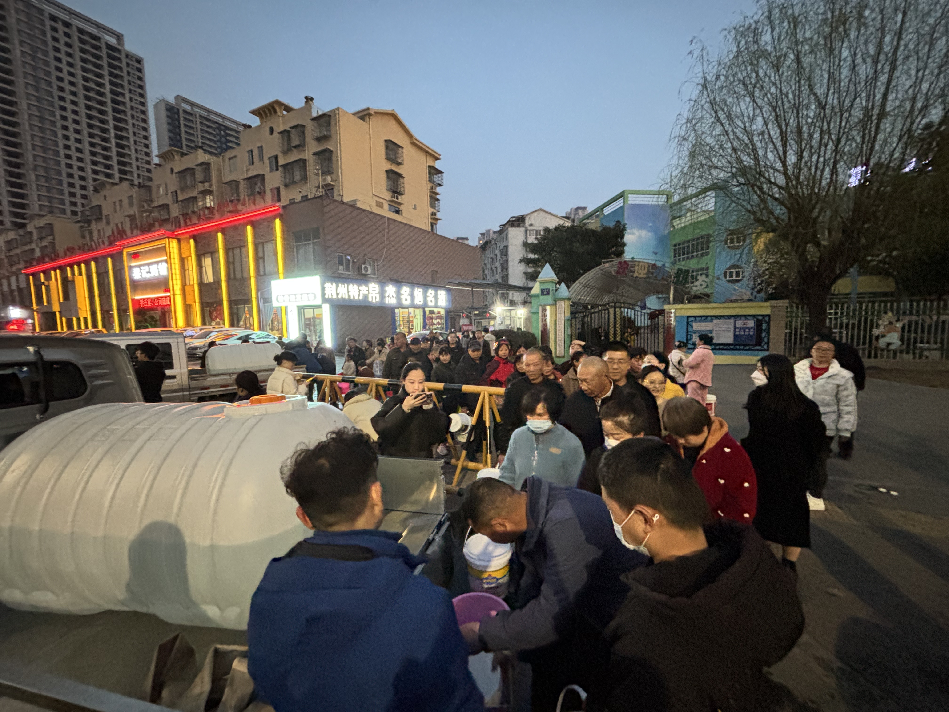荊州水務(wù)集團(tuán)接到任務(wù)后,迅速組織管網(wǎng)搶修、轄區(qū)客服中心人員趕赴現(xiàn)場,同步啟動搶修及臨時送水應(yīng)急措施。搶修人員首先定位管網(wǎng)閥門進(jìn)行緊急關(guān)停,待流水止住后開始尋找漏點(diǎn)。與此同時,客服中心送水車輛,已陸續(xù)為津泰園、711生活區(qū)等周邊小區(qū)和居民送水。