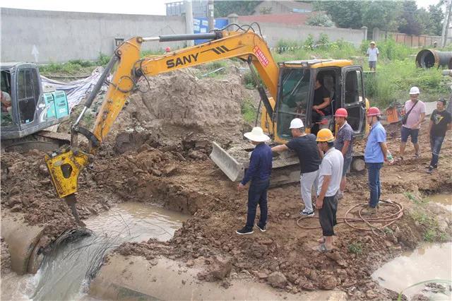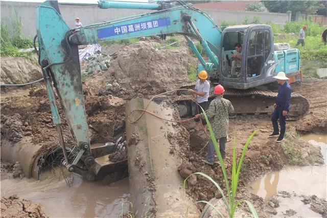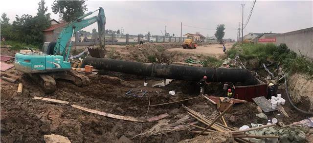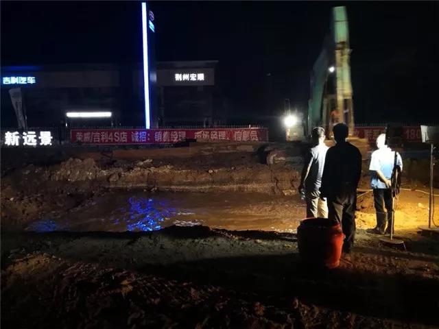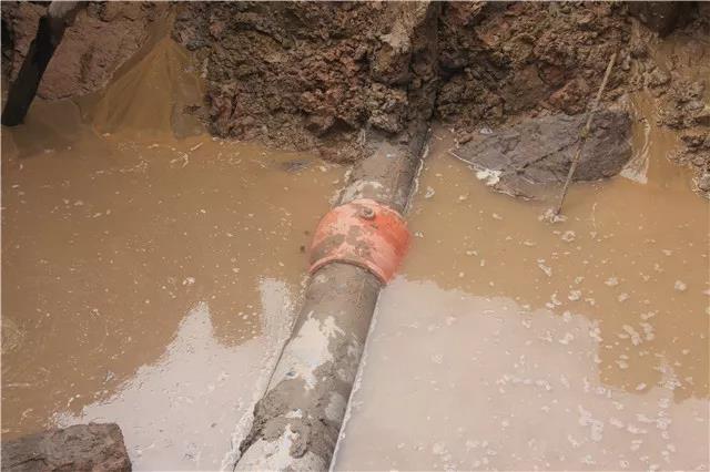6月12日晚7點,荊監(jiān)一級公路楊場收費站附近DN400 供水管道被路政施工人員打穿破裂,自來水噴涌而出,周邊瞬間成為汪洋。接到報漏電話后,公司24小時搶險值班隊伍半個多小時便趕到了現(xiàn)場,果斷在第一時間關(guān)閥止水。為了加快搶修進度,及時恢復(fù)沿線用戶供水,在已是夜間且管道埋藏較深的情況下,搶修人員克服困難,多方協(xié)調(diào)了鋼板樁打樁機及長臂挖機等大型機械設(shè)備,經(jīng)過緊張、有序、繁重的施工后,在次日凌晨7時開挖出被破壞的供水管道。隨后搶修人員又爭分多秒,在已是連續(xù)奮戰(zhàn)超過12個小時的情況下,又對破裂管道進行清洗、修復(fù)、開閘等一系列工作,最終于13日9時恢復(fù)了供水。