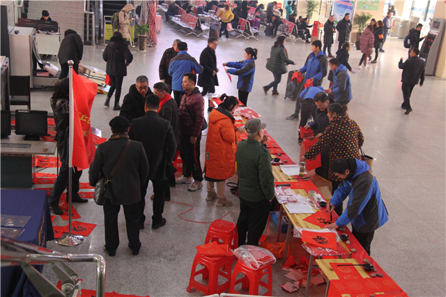 此次活動(dòng),書(shū)法家們?yōu)槁每蛡儗?xiě)下近500幅春聯(lián),為旅客們送上最真摯的新春祝福,來(lái)往的旅客們切實(shí)感受到關(guān)懷與溫暖。