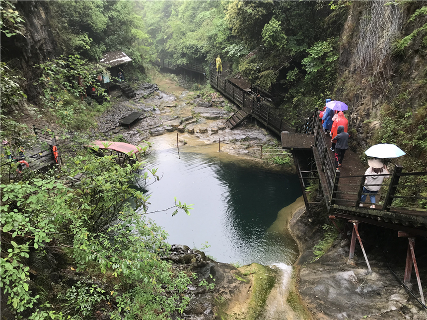 到達(dá)景區(qū)后,大家進(jìn)行了短暫的調(diào)整,除卻舟車的疲憊后就開始了登山。雨淅淅瀝瀝,可絲毫沒有影響大家的熱情。一邊爬山一邊欣賞美麗的風(fēng)景,心中的煩惱和壓力在這一刻得到釋放。峽谷內(nèi),西溝十八潭,潭潭相連;碧峰銀瀑,環(huán)繞其中,讓人心曠神怡,流連忘返。