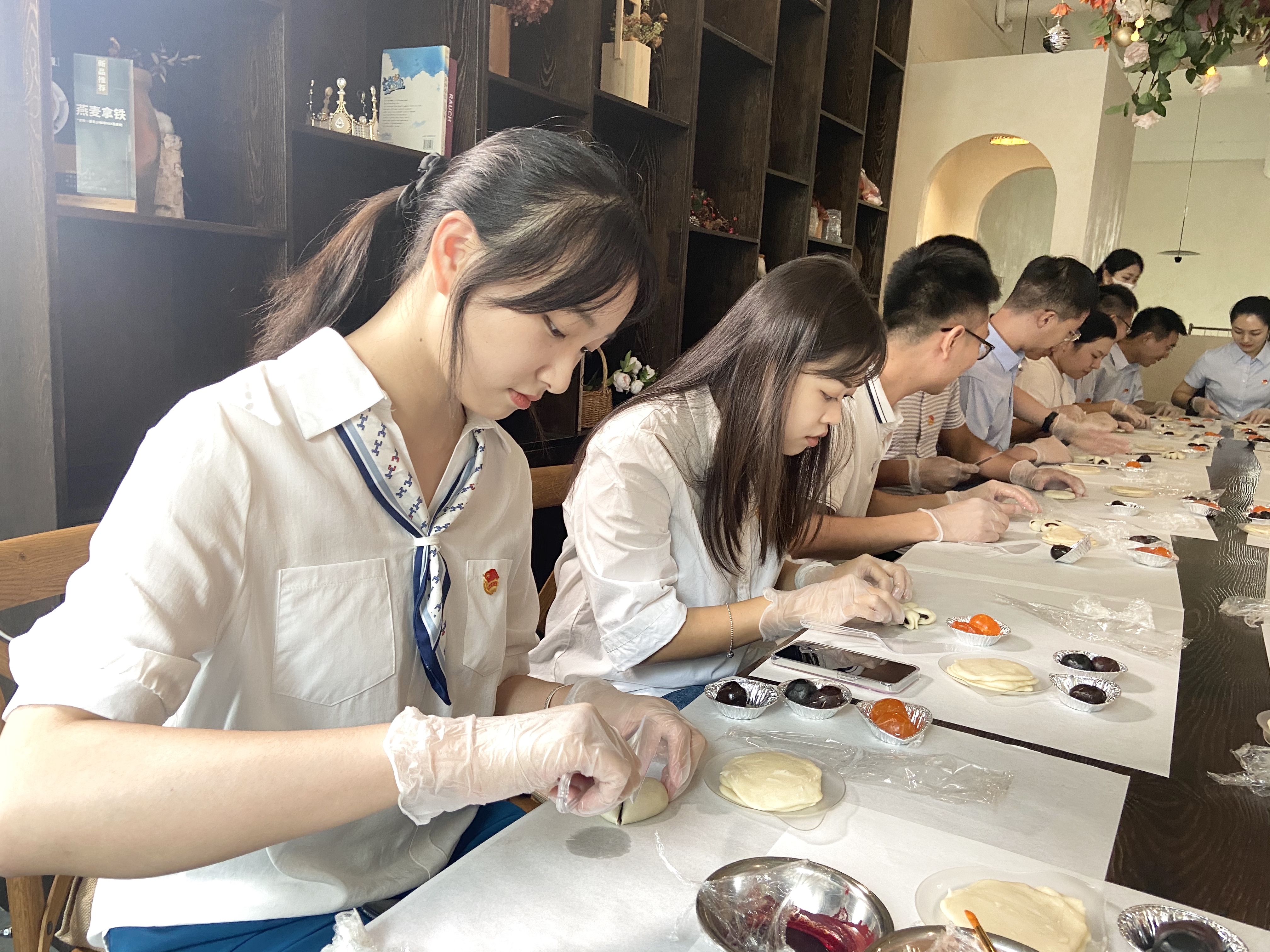 在活動現(xiàn)場,烘焙老師耐心的為大家現(xiàn)場教學講解了做月餅的步驟及注意事項。“制作時,一定不能用蠻力,手要靈活,像這樣讓面團把餡料一點點包裹……”,聽完老師的講解,大家都躍躍欲試,開始用酥皮和各種口味的餡料制作DIY月餅。大家不時的相互交流請教,還不忘跟小伙伴們分享如何包裹的更加嚴實,現(xiàn)場一片歡聲笑語。不一會兒,一枚枚獨具特色的棗泥酥和DIY月餅就誕生了,大家奇思妙想,還在月餅上為自己描繪了形式多樣的專屬的標記。