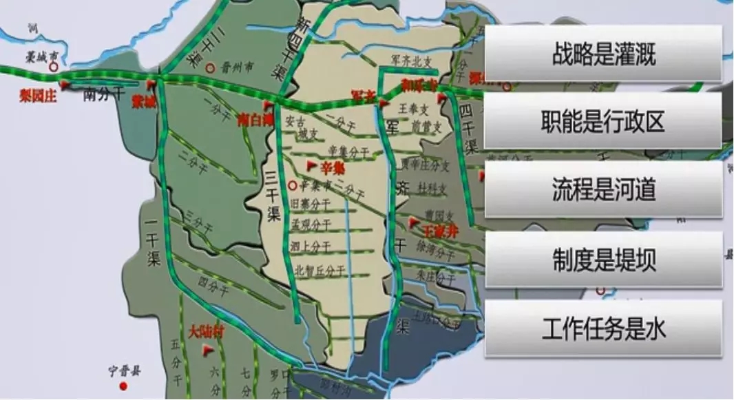 戰(zhàn)略是定位,流程是執(zhí)行。在這張圖里,戰(zhàn)略是灌溉,它就是靠這些河道來實現的。職能是行政區(qū),不論行政區(qū)域怎么改變,這條河道的狀態(tài)都不會發(fā)生改變。如果流程是河道的話,制度就是堤壩。所以流程不會隨著組織的變化而變化,它具有相對的獨立性,它應該成為企業(yè)的最佳視角。