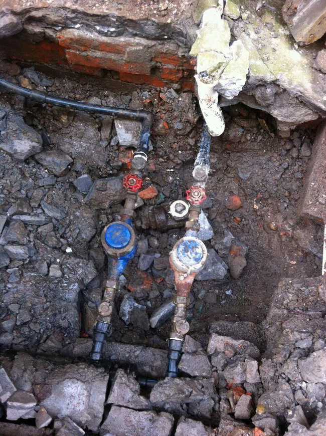當(dāng)天晚上,在景明觀路搶修現(xiàn)場的城區(qū)客服中心負(fù)責(zé)人考慮到如果不及時解決該用戶漏水問題,用戶的損失將越來越大。21:10時,當(dāng)景明觀路損壞的加油站DN150開口閘閥更換止水后,經(jīng)同管網(wǎng)管理中心副經(jīng)理陳亮協(xié)商,決定連夜進行處理??傻竭_現(xiàn)場發(fā)現(xiàn)一樓用戶已經(jīng)將管道封堵在墻內(nèi),無法處理。清理完過道雜物,打開水表箱后發(fā)現(xiàn)原DN40水表一半砌在表井墻內(nèi),一半在外,表前閘閥也被埋,施工難度很大。用戶考慮到時間太晚,施工人員都沒有吃飯,主動提出改天再處理并對我們的服務(wù)再三表示感謝。