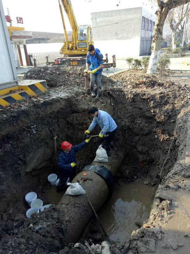 12月27日上午7點(diǎn),荊州水務(wù)管網(wǎng)管理中心接到報(bào)漏電話,反映位于沙市區(qū)北京東路銀信集團(tuán)門前供水主管發(fā)生管漏,有自來水流進(jìn)銀信集團(tuán)公司內(nèi)院內(nèi)。得知這一情況后,管網(wǎng)管理中心迅速組織搶修人員趕赴現(xiàn)場(chǎng),并在第一時(shí)間關(guān)閉閥門止水。在對(duì)現(xiàn)場(chǎng)勘察后發(fā)現(xiàn)是位于北京東路路邊下方DN800供水主管因橡膠老化而發(fā)生的管漏。而此時(shí)正逢上班時(shí)間,管漏點(diǎn)又位于城市主干道,在主管道閥門關(guān)閉后,沙市東區(qū)部分片區(qū)將停水,為了不影響市民的正常生活,水務(wù)集團(tuán)管網(wǎng)中心迅速調(diào)集主要搶修力量、搶修物資和大型挖機(jī)趕赴現(xiàn)場(chǎng)實(shí)施搶修,并要求必須在下班前完成搶修任務(wù)。搶修開始后就遇到了困難,由于管道漏點(diǎn)上方正好是城市街道的大型景觀樹,必須用大型起重設(shè)備吊起才能施工,搶修隊(duì)又緊急聯(lián)系上了工程公司的吊車配合施工。