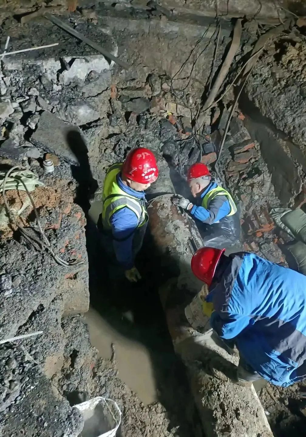 隨著夜幕降臨,在挖掘機(jī)的來回伸收之間,管道破損位置顯露出來,搶修人員結(jié)合現(xiàn)場情況制定了修復(fù)方案,此時工作坑內(nèi)不斷有雪水和污水涌進(jìn),他們一邊制做管道修復(fù)鋼制件,一邊加速對坑內(nèi)積水進(jìn)行抽排,寒風(fēng)刺骨,時間已到晚上11時,此時條件具備,維修人員跳入工作坑里開始對管道進(jìn)行修復(fù),他們顧不上泥水臟冷,緊張而忙碌配合,加快速度維修,經(jīng)過漫長而緊張的8小時奮戰(zhàn),凌晨4點鐘維修工作全部完成,管線恢復(fù)供水。
