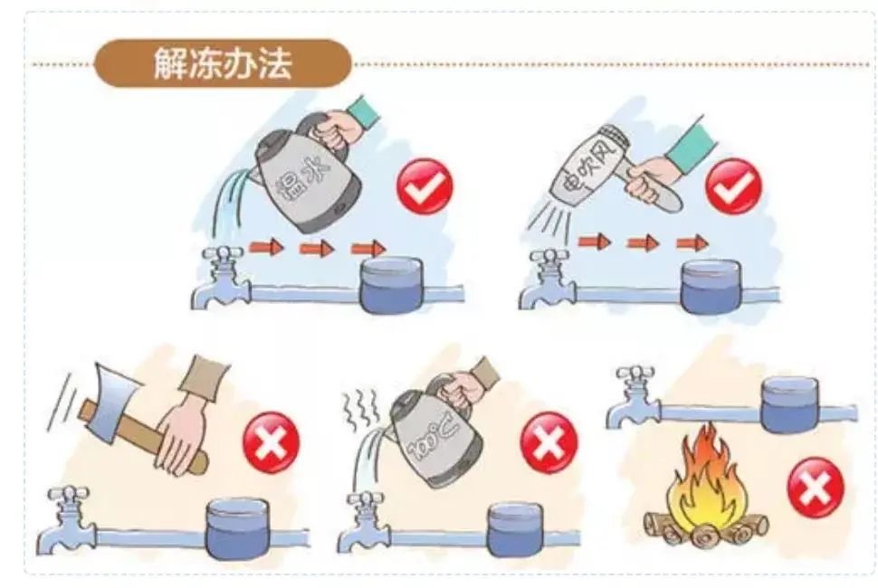 切忌用硬物敲擊、用開水澆灌或用火烘烤,也不可用鉗子、扳手等工具強(qiáng)行啟動(dòng)水龍頭和閥門,以免水管爆裂,水龍頭、閥門、水表等用水設(shè)施損壞。